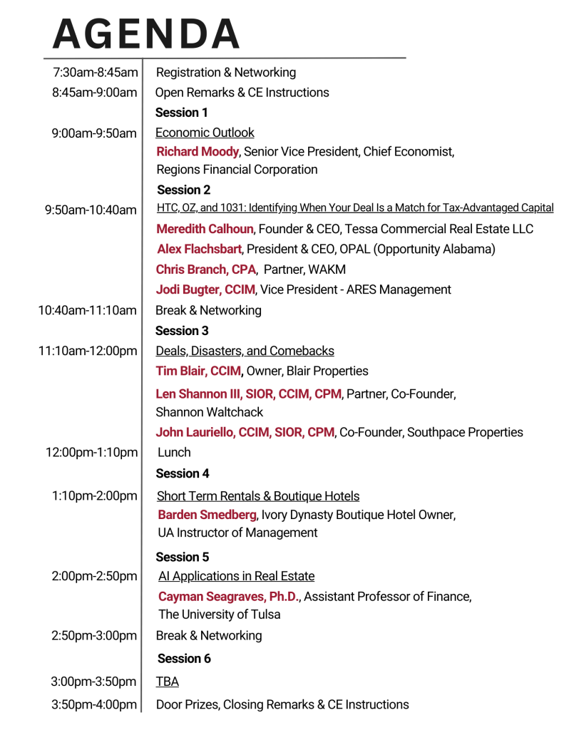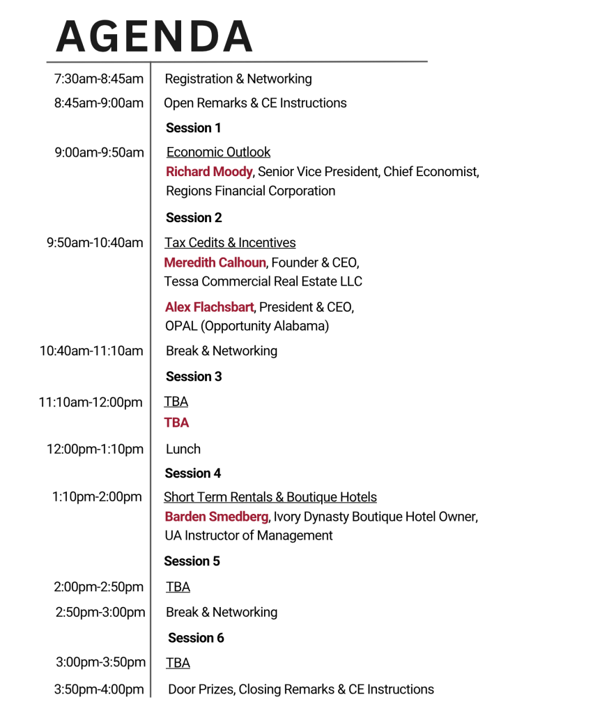 The Alabama Center for Real Estate reserves the right to cancel, postpone, or combine sections or make instructor changes.