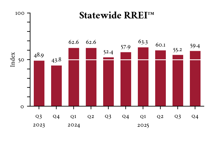 In the Q4 2025 survey, the AL RREI™ registered a score of 59.4, signaling moderate confidence that Alabama’s residential market will continue to improve. This marks the eighth consecutive quarter with an expansionary reading. All six index components scored above 50, and each increased from the previous quarter.Respondents expressed strong confidence that interest rates will decline and listings will rise, moderate confidence that both the Alabama and U.S. markets and home sales will improve, and mild confidence that home prices will increase.